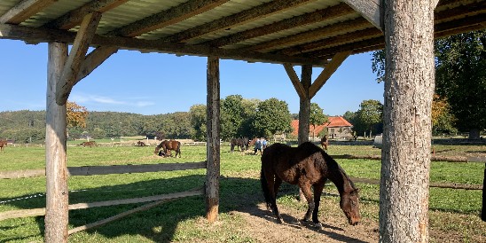Seit einiger Zeit bieten wir den Pferden auf den Weiden auch Unterstände an, damit sie nicht der prallen Sonne ausgesetzt sind, wenn sie das wollen.