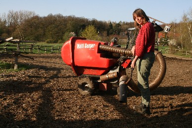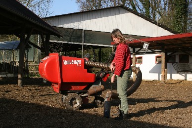 Da wir täglich die Paddocks drei bis vier Mal reinigen, haben wir tatkräftige maschinelle Hilfsmittel. Mit dem "Pferde-Äppel-Sauger" kann man hervorragend das Fallobst von den Paddocks einsammeln.